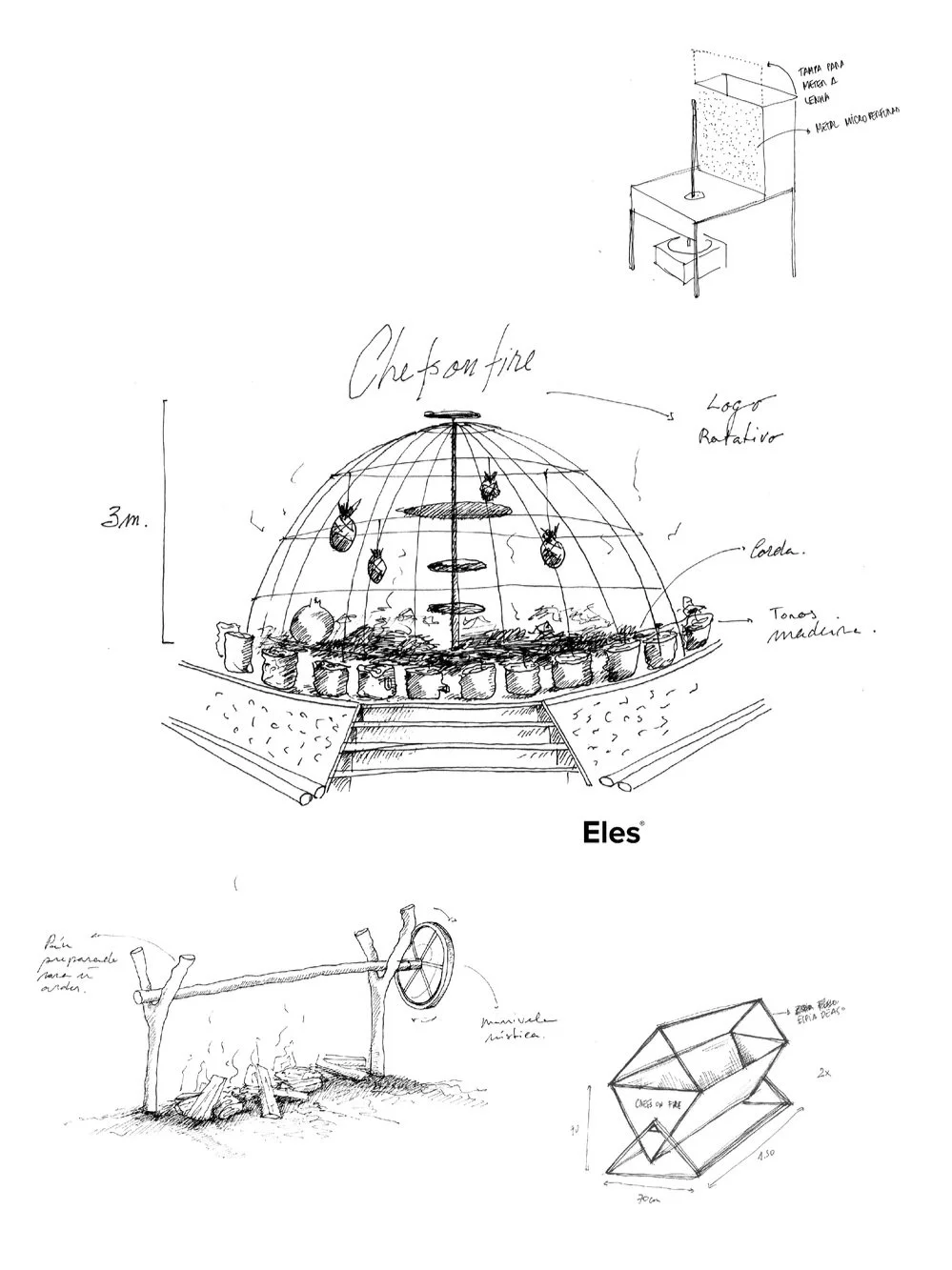 Early fabrication prototyping presentation for cooking areas . From Top Right to Bottom Right: Kebab wheel, Barbecue Dome, Steer Skewer, Charcoal Dry Pit.